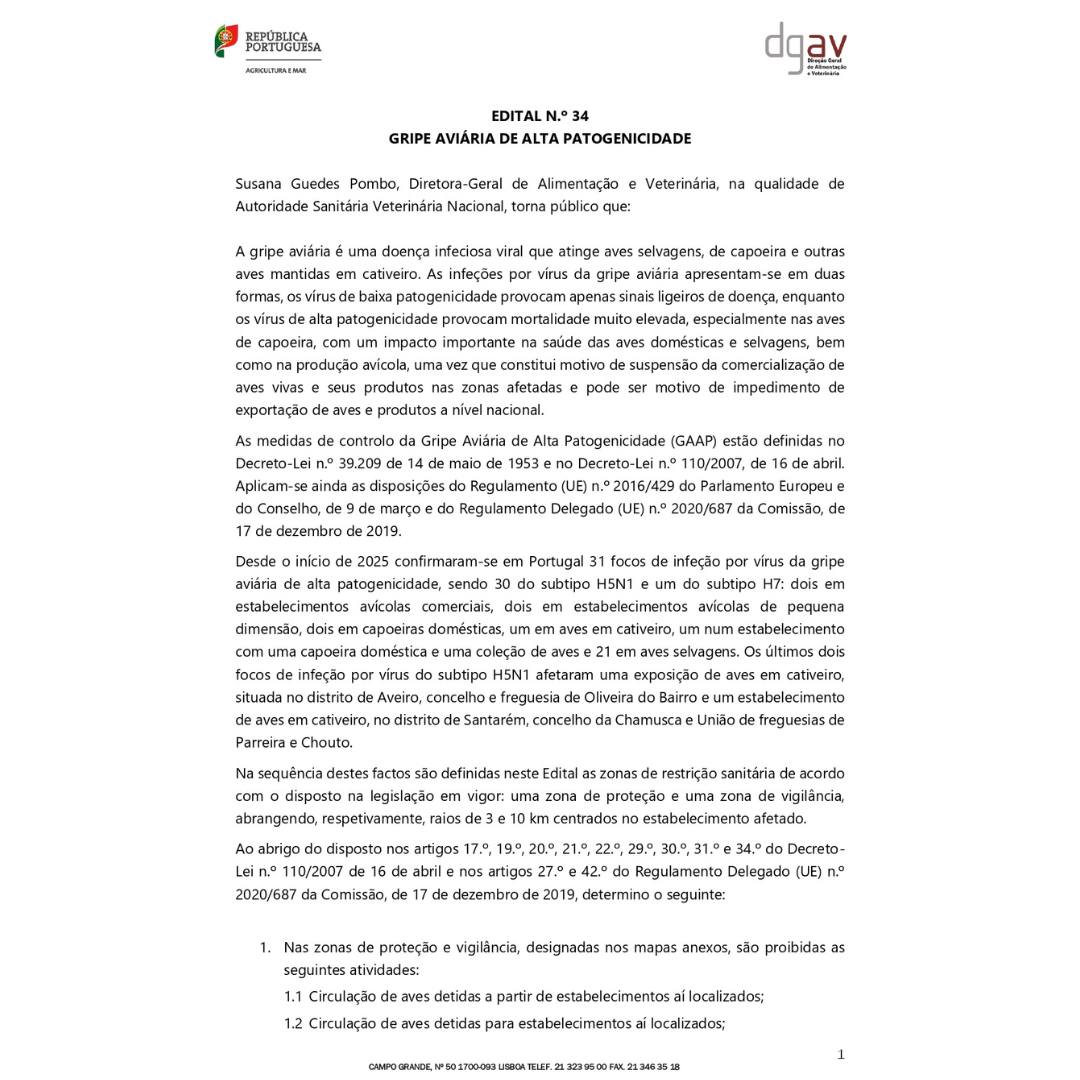 A Direção-Geral de Alimentação e Veterinária (DGAV) confirmou recentemente um foco de Gripe Aviária de Alta Patogenicidade (H5N1) no concelho da Chamusca, na União de Freguesias de Parreira e Chouto.